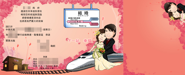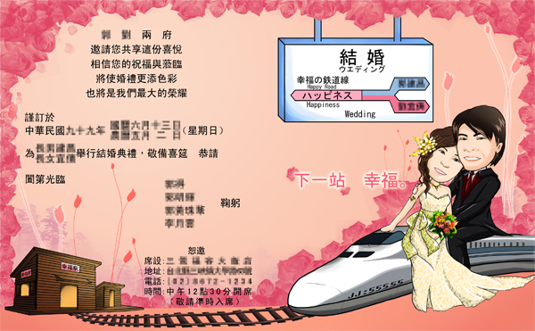 因此我們就想說讓新郎新娘坐在火車上,前往「幸福駅」也就是 幸福站